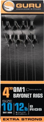 Monturile QM1 Bayonet Ready sunt opțiunea perfectă pentru pentru momeli de cârlig, cum ar fi wafters, boilies și pop-up. Montura QM1 are o baionetă Guru la capătul firului de păr. Acesta este destinat să fie împins în momeala aleasă de dvs. Include o bucată de micro-tub de silicon de 0,3 mm pe tijă, pentru a fixa momeala și pentru a vă asigura că montura funcționează perfect.
