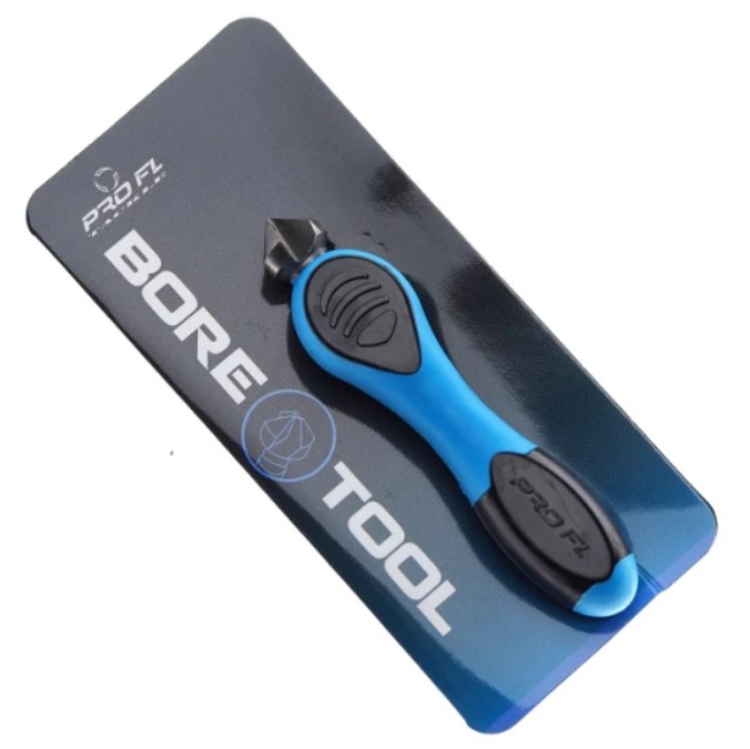 Bore Tool este un dispozitiv special cu ajutorul caruia puteti indeparta rapid o sectiune conica din boilies sau pop up, permitand astfel momelilor sa se lipeasca intre ele mai strans pe firul de par. Este recomandat sa fie utilizat pentru situatiile in care pescuiti cu doua boilies-uri pe firul de par sau cu montura de tip snowman. Dispune de un design ergonomic, manerul tratat antialunecare asigurand o priza ferma in momentul utilizarii. Este finisat in culorile albastru si negru.