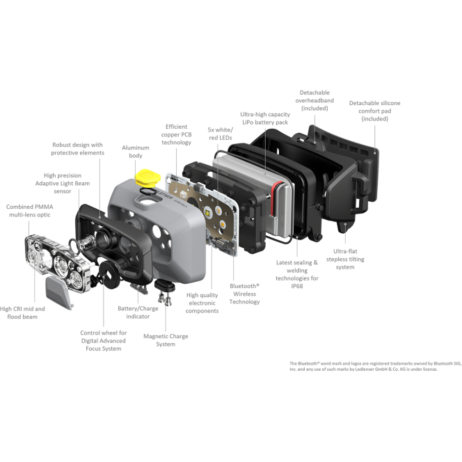 Caracteristica care iese in evidenta este tehnologia in curs de brevetare Adaptive Light Beam, care, odata activata, permite reducerea si focalizarea automata a intensitatii luminoase, ceea ce o face o lanterna frontala hands-free care nu necesita niciun control manual. O alta tehnologie in curs de brevetare, sistemul intuitiv Digital Advanced Focus System, asigura o focalizare perfecta de la spot la flood. Daca sunt necesare controlul de la distanta si alte functii de personalizare, acestea pot fi obtinute prin intermediul aplicatiei Ledlenser Connect App (upgrade platit).