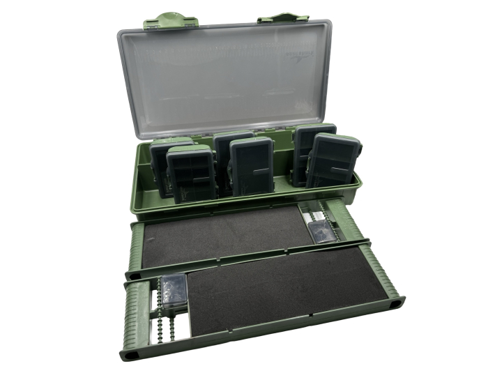 - Cutiile din randul superior: Contine sase cutii mai mici, fiecare avand compartimente ajustabile pentru depozitarea carligelor, plumbilor, vartejurilor si a altor mici accesorii.