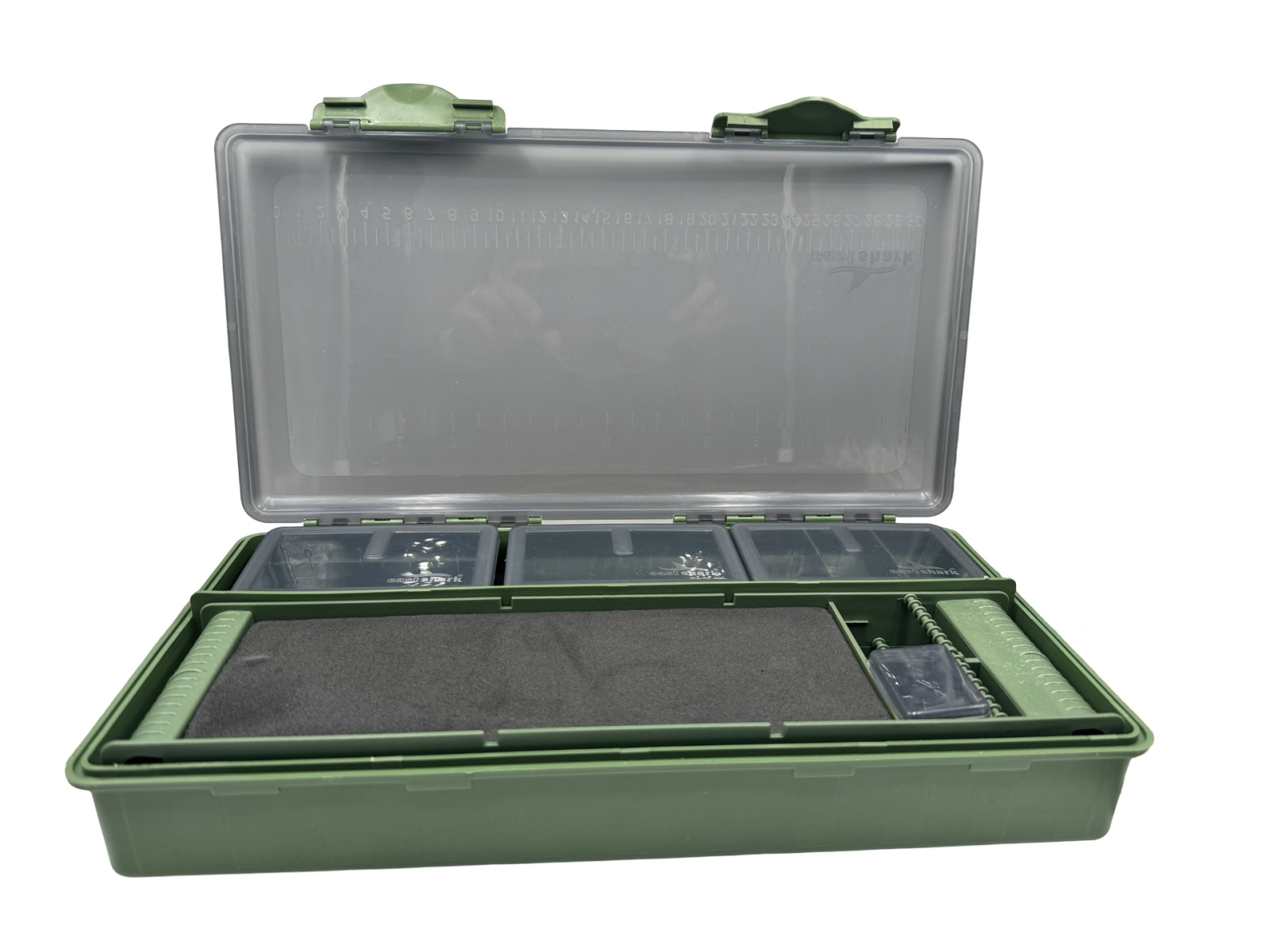 - Compartimentare: Cutia principala este compartimentata pentru a permite organizarea eficienta a accesoriilor de pescuit.