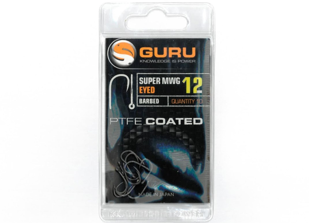 Guru Super MWG Eyed Barbed sunt carlige extrem de versatile (cu micro spin) extra strong special concepute atat pentru pescuitul la feeder sau la match (waggler), cat si pentru alte stiluri de pescuit. Carligele dispun de o forma clasica Wide Gape (testata si demonstrata in timp ca fiind una dintre cele mai eficiente forme ale unui carlig atunci cand dorim rezistenta si o libertate foarte mare in ceea ce priveste alegerea momelilor pentru carlige). Varful beneficieaza de o tehnologie speciala patentata de specialistii Guru, creata pentru o penetrare perfecta, foarte bine ascutit si nu in ultimul rand extra-durabil. Carligele sunt fabricate din otel forjat japonez si dispun de acoperire PTFE ce garanteaza durabilitatea in timp si un camuflaj discret in apa.