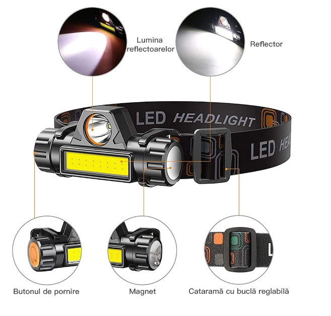 Lanterna cap cu acumulator intern, cu incarcare prin cablu USB.
