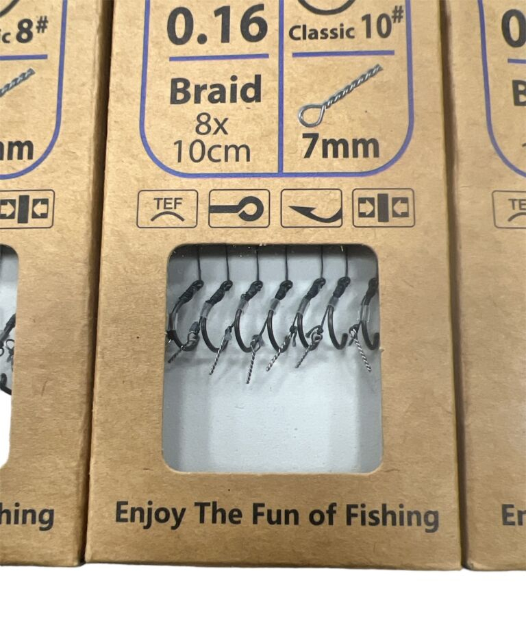 Acest set de carlige legate FL cu spin surub sunt echipate cu un carlig ascutit de marime 10, 12 sau 14, cu un fir textil de 0.16mm in 8 spire si spin.